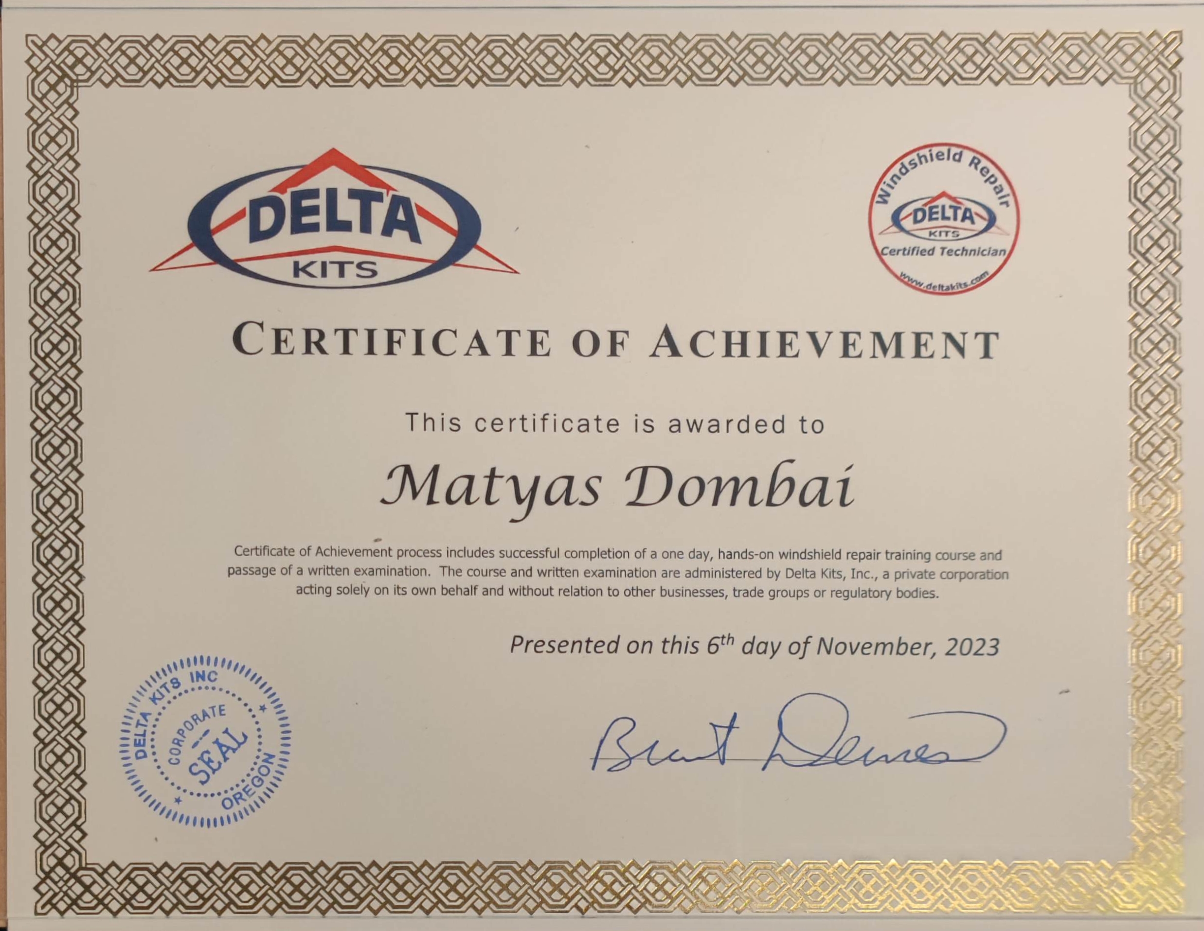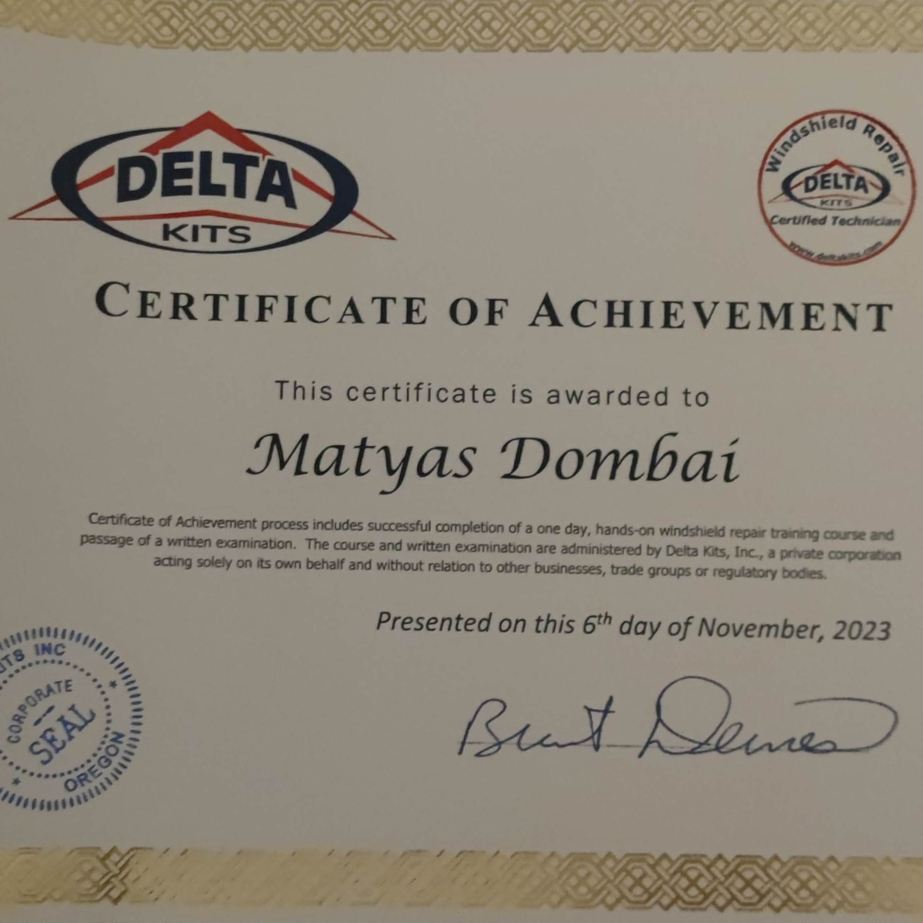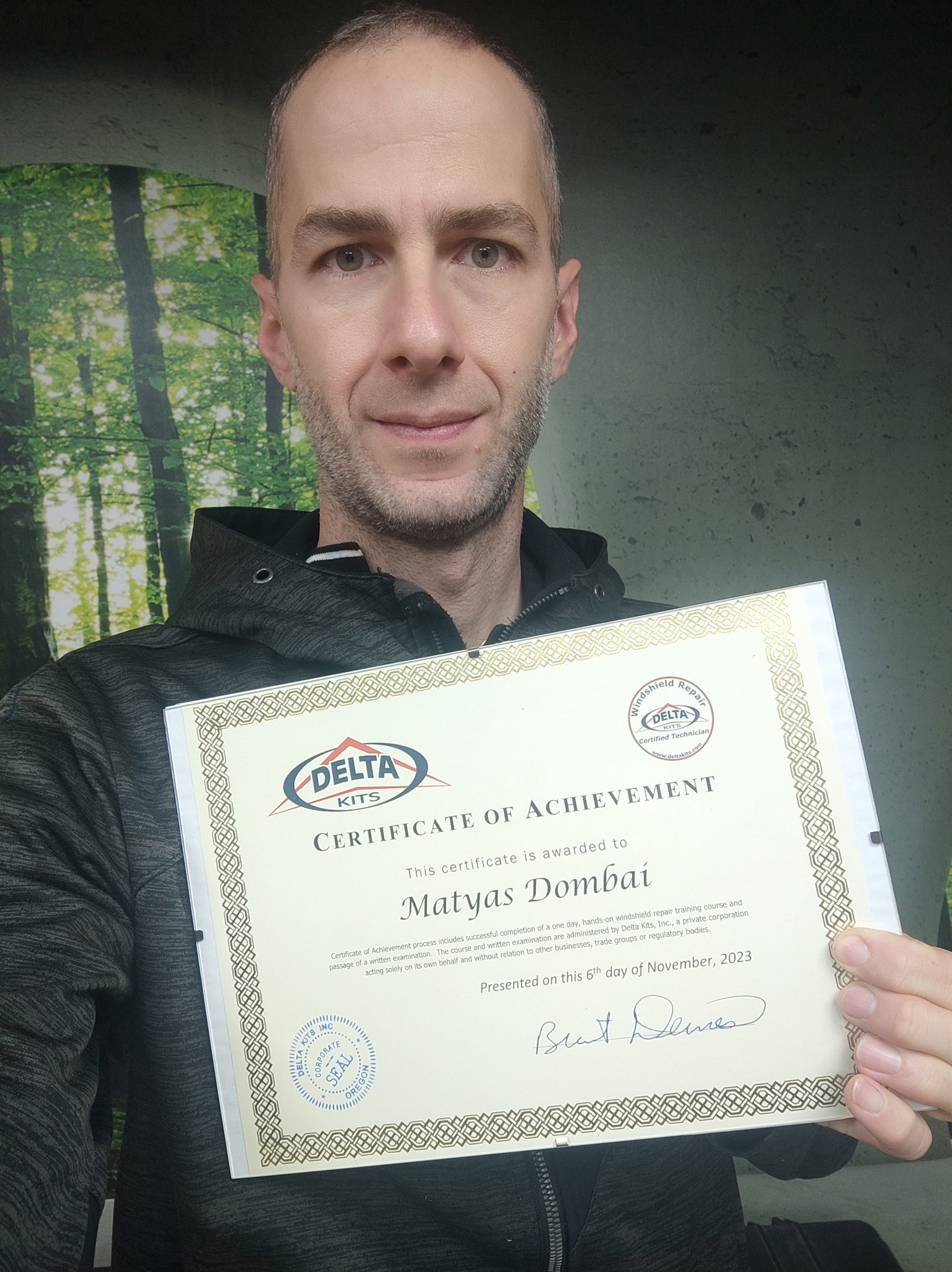 2023 Novemberében sikeres vizsgát tettem Amerikában, Szélvédő Javításból, így elnyerve a Nemzetközileg elismert "Szélvédő Javító Mester" címet.